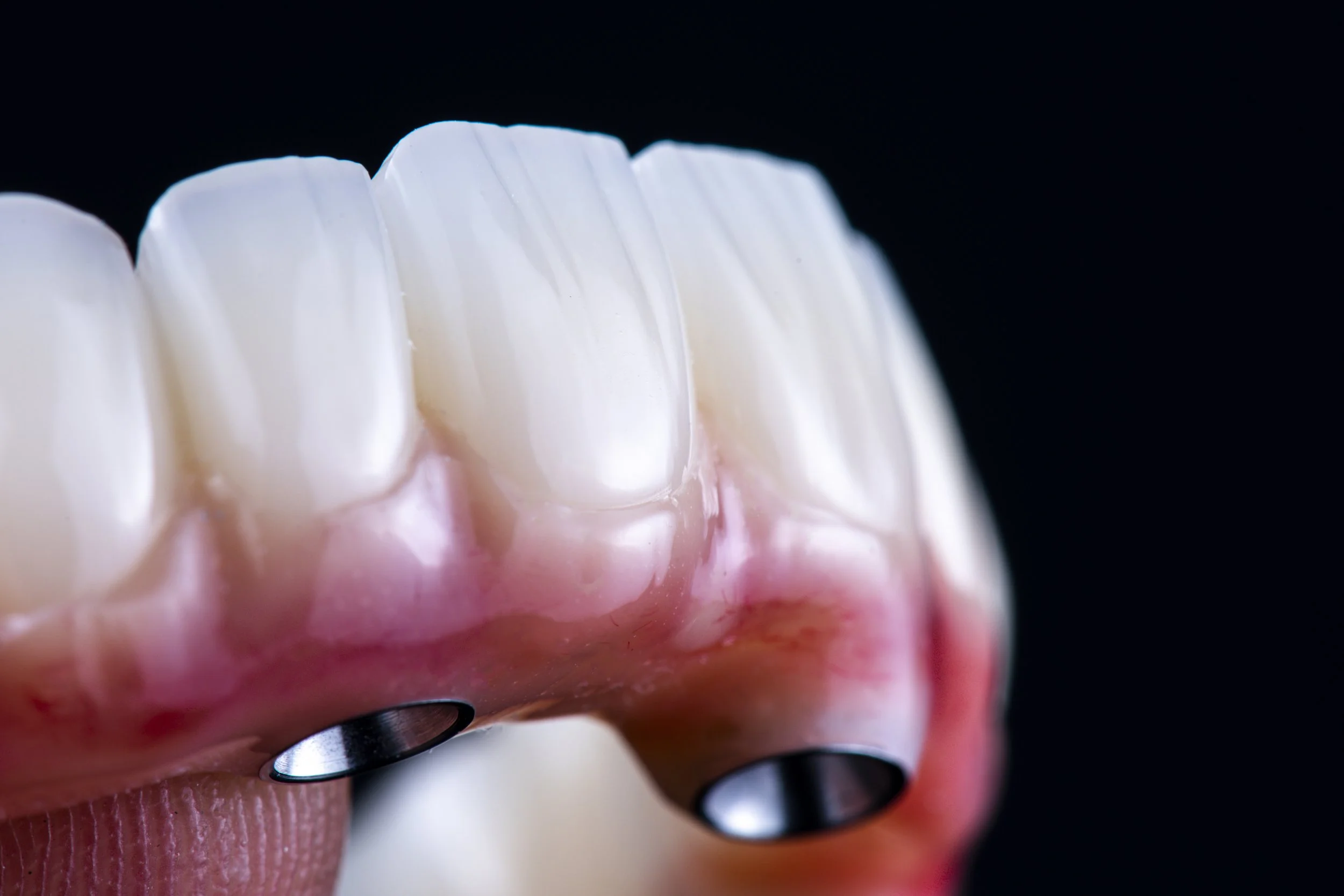 It is a ceramic bridge made of several crowns connected together and is used to replace several missing teeth. It has a false tooth (pontic) that is held in place by the abutment implants on either side of the gap.
